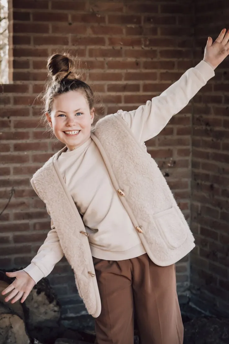 Maat 80-86 t/m 104-110 hebben 1 knoopje, vanaf maat 116-122 heeft het gilet 2 knoopjes.