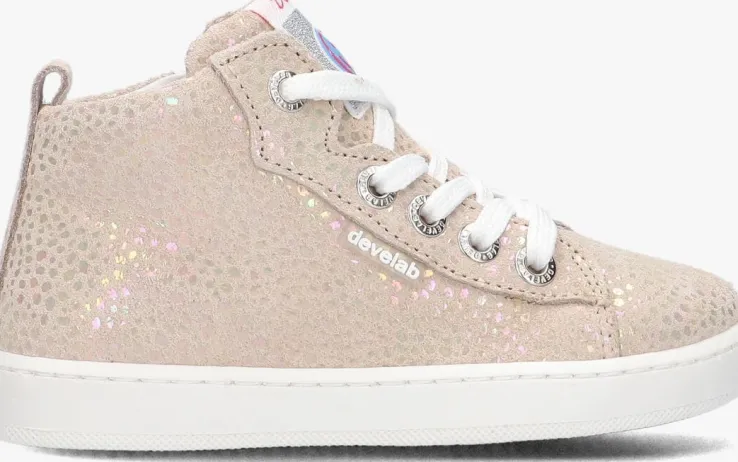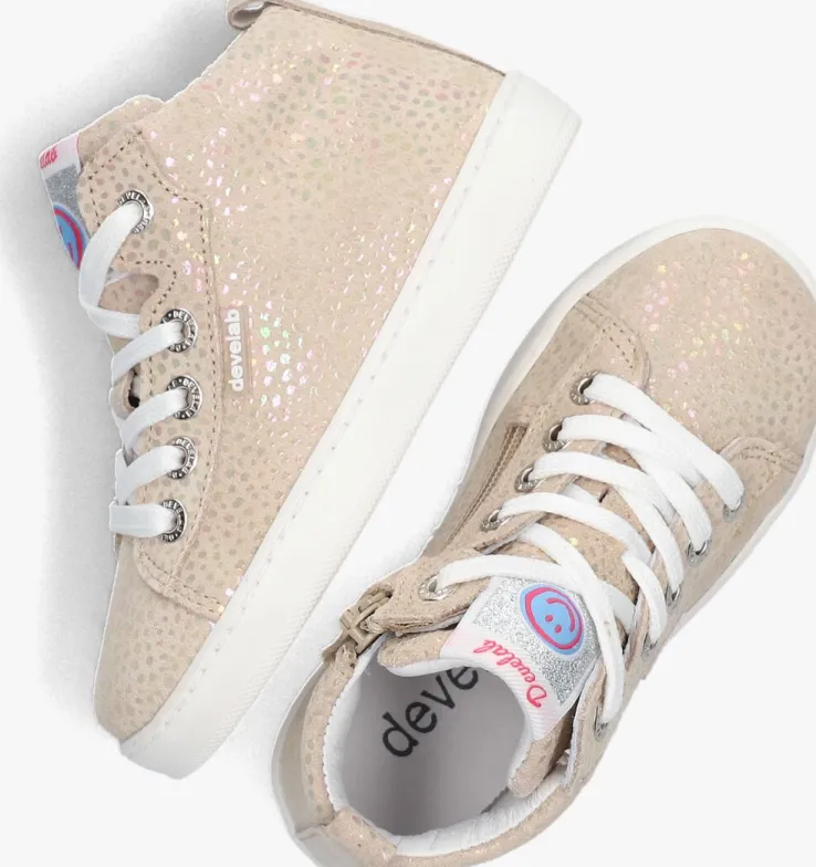 Op dezeschattige hoge sneakers 41492 van het merk DEVELAB zie jij je kleine meid toch al lopen? De buitenkant is gemaakt van beige suède met een kleurrijke holographic folie met stippenprint. De tong is gesierd met eentextiel merklabel, op de zijkant zit een rubber merklabel en de veterringen zijn gesierd met merkreliëf. Aan de binnenzijde van de schoen is een ritssluiting met klittenbandje bevestigd, waardoor je ‘m gemakkelijk aan- en uittrekt bij jouw kleintje. Het binnenwerk heeft een comfortabele, lederen voering en een uitneembaar voetbed.Het rubberen zooltje is voorzien van een gripvast golvend profiel waardoor jouw kleintje veel grip heeft bij het klimmen en klauteren.
