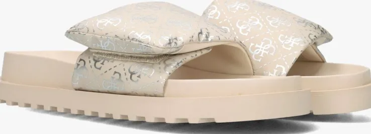 Voeg een zomerse uitstraling toe aan je outfit met deze beige slipper FABETZY uit de collectie van het merk GUESS! Deze slipperheeft een brede band met zilverkleurige merkopdrukken over de wreef en heeft een klittenbandsluiting. De band is gevoerd met lederlook materiaal en het licht opgevulde voetbed met een suèdestuk onder de hiel zorgtvoor een prettig loopcomfort. De rubberenzool met grof profiel zorgt voor uitstekende grip tijdens lange avondwandelingen. Draag deze sprankelendeslipperonder jouw favoriete zomeroutfit en steel de show!