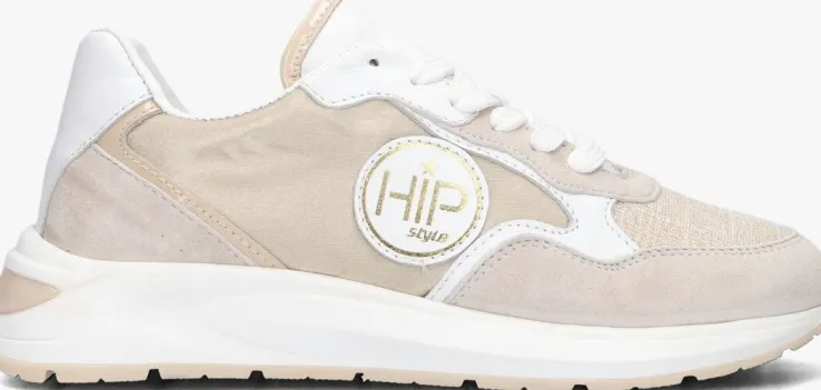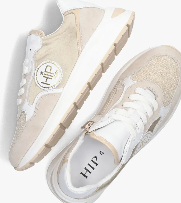 Het merk HIP heeft niet voor niks het woord ‘hip’ als merknaam. Met de schoenen uit de collectie van dit merk ben jij gegarandeerd van een hippe schoen en loop je er altijd trendy bij. Deze goudkleurige, lage sneaker H1094 is uitgevoerd in goudkleurig nylon op de zijkant, heeft goudkleurig glittertextiel op de neus en is voorzien van leren en suède overlays in de kleuren wit en beige. Opvallend is het leren merkembleem op de zijkant en de witte tong met beige lak afwerking. Dankzij de ritssluiting naast de vetersluiting trek je ‘m gemakkelijk aan en uit. Voor een stoere look is dit model afgewerkt met een rubberen chunky zool en een bruine inzet met merkreliëf. Het binnenwerk is gevoerd met leer en heeft een uitneembaar, leren voetbed. De zool is voorzien van een gripvast profiel voor een goede grip en uitstekende stabiliteit!