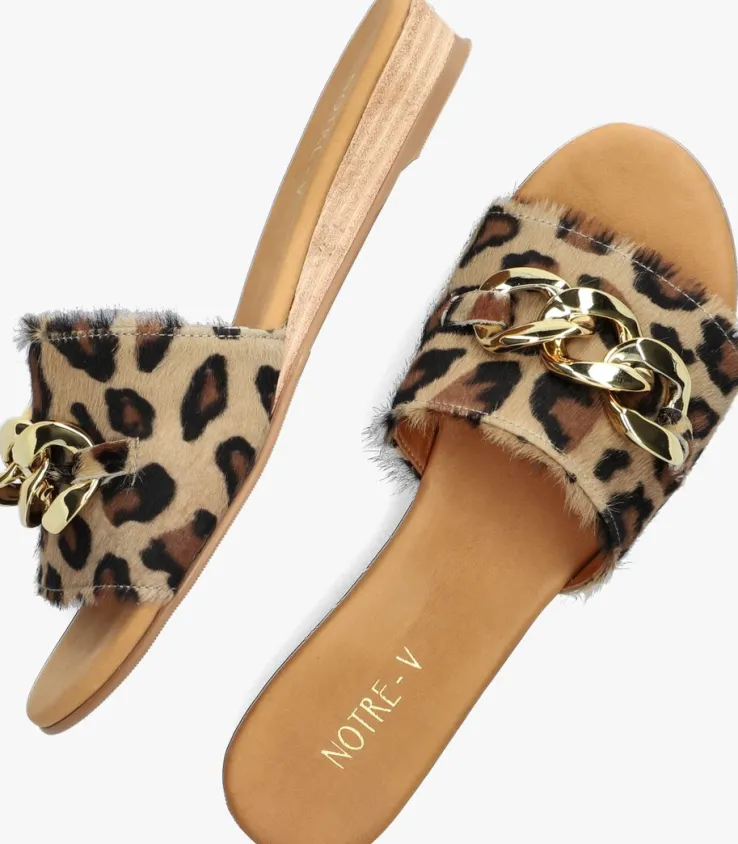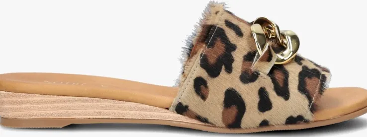 Als je het over hippe slippers hebt, dan is de 119-123 van het merk NOTRE-V er zeker één! Deze opvallende beige slipper is gemaakt van luxe materialen met stoere accenten en een knipoog naar de laatste trends. Het bovenwerk heeft een brede band van ponyhair met panterprint en een oversized, goudkleurige schakelketting op de wreef voor een chique touch.Het binnenwerk is gemaakt van zachtleer met een licht gevoerd voetbed om extra ondersteuning te geven. De flexibelerubberen loopzool heeft een gelaagd hakje van ongeveer 3 centimeter hoog en eenfijn lijntjes profiel voor extra grip tijdens al je wandelingen door de stad of over een zonnige boulevard. Combineer hem met je favoriete zomerse outfit en je bent ready to go!