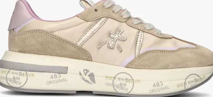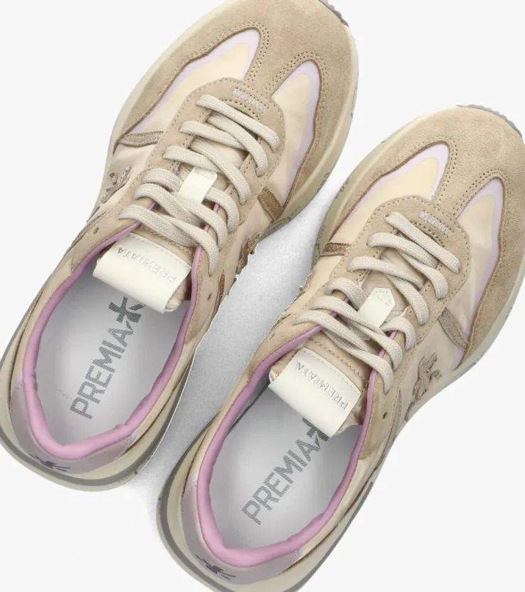 Het Italiaanse merk PREMIATAkenmerkt zich door anders te zijn dan alle anderen en daardoor krijgt iedere schoen een unieke uitstraling. Dat zie je ook terug in deze beige sneakerCASSIE met veelzijdig bovenwerk en toffe accenten. Dit model bestaat uit champagne kleurig nylon textiel met panelen van beige suède en heeft goudkleurige en paarse accenten. De paarse hielcap en het witte merklabel op de tong is voorzien van leatherlook. De opvallende zoolis uitzonderlijk licht van gewicht en heeft een goede grip door het profiel in de grijze loopzool en de zoolrand is gesierd met bruine merkopdrukken. Zowel de gewatteerde enkelkraag als het grijze inzetstuk zorgen voor extra ondersteuning en comfort. Het binnenwerk is gemaakt van leer en heeft een uitneembaar voetbed. De perfecte schoen met optimaal comfort en dé juiste looks voor elk avontuur!