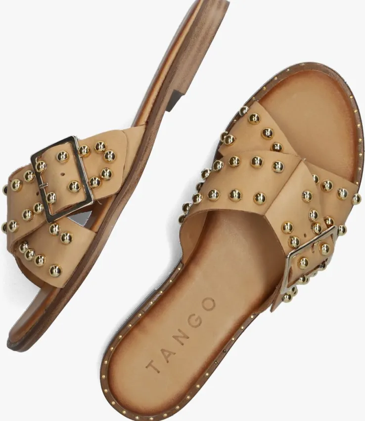 Is it summer yet? Deze beige MILA 31 slipper van het merk Tangois perfect voor iedere zomerse look! Opvallend zijn de brede bandjes met een naar binnen gestikte wreefnaad en natuurlijk de goudkleurige bolstuds in combinatie met de goudkleurige siergesp voor een extra stoere touch. Extra gaaf zijn de smalle bolstuds in de zoolrand, waardoor deze sandaal één geheel wordt. Het beige voetbed heeft een zachte foam vulling voor een aangename demping bij iedere stap.De slippers zijn geheel van leer gemaakten dezool is gemaakt van rubber met een fijn profiel. Draag de slippers met je favoriete zomerjurk, onder een rokje of een mooie denim jeans.