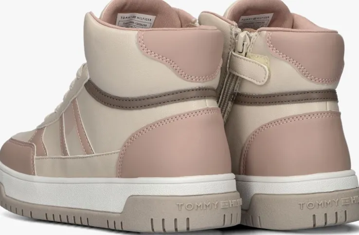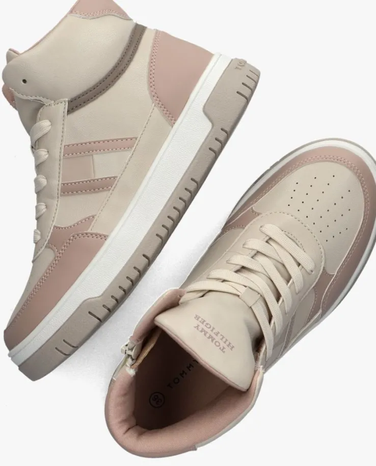 Stap in stijl met deze FLAG HIGH TOP LACE-UP sneakers van TOMMY HILFIGER. Deze trendy hoge sneakers zijn perfect voor meisjes die op zoek zijn naar een casual en modieuze look. De beige kleur en lichtroze overlays geven deze schoenen een speelse uitstraling. Het bovenwerk bestaat uit leatherlook, de tong is voorzien van perforaties, de enkelrand heeft een grijze kleur en de merkemblemen zijn te vinden op de tong, zijkant en zoolrand. Met de handige ritssluiting, is het ook nog eens praktisch. Je ervaart een heerlijk comfort dankzij de gewatteerde tong en enkelkraag. De textielen voering zorgt ervoor dat je de hele dag kunt genieten van optimaal draagcomfort. Combineer deze sneakers met een stoere jeans en een trendy T-shirt voor een complete outfit.
