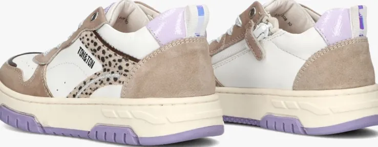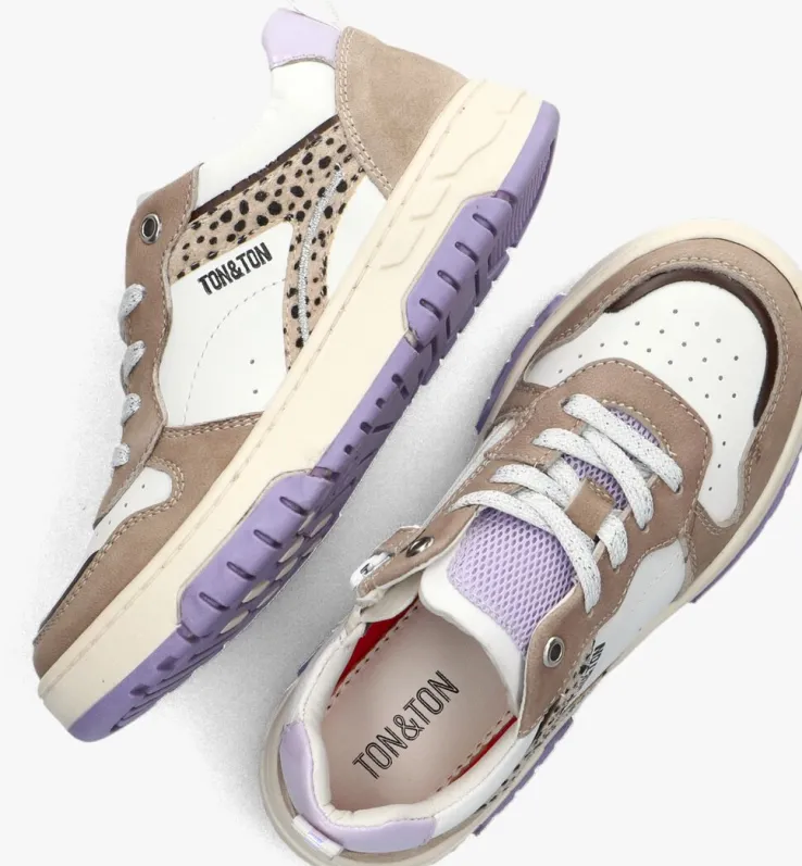 De MIKAELA lage sneakers van TON & TON zijn perfect voor meisjes die dol zijn op leuke schoenen! Deze trendy schoenen zijn gemaakt van wit leer met panelen van bruin leatherlook en paars. Extra tof is het beige ponyahir met pixelprint aan de zijkant. Het uitneembare voetbed zorgt voor extra comfort. Je trekt de schoenen razendsnel aan door de ritssluiting. De zool is gemaakt van rubber, waardoor je grip hebt op elke ondergrond. De MIKAELA sneakers passen goed bij een casual outfit, zoals een jeans en een leuk T-shirt. Of combineer ze met een rokje voor een speelse look. Met deze sneakers ben je helemaal klaar om te stralen!