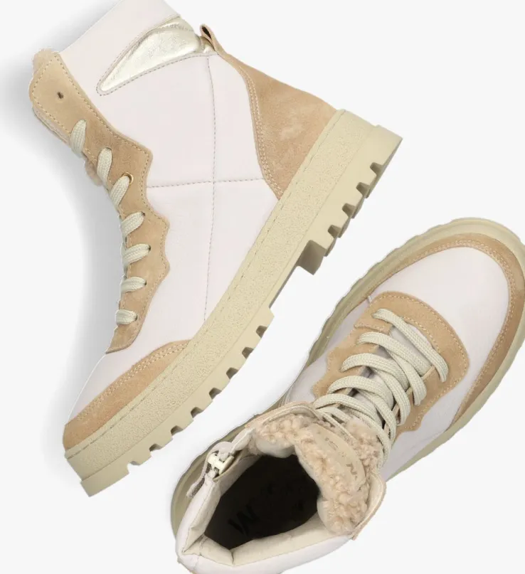 Hét nieuwe schoenenmerk voor coole kids, WYSH, staat voor Wear Your Shoes en is voor eigenwijze types die hun eigen stijl volgen. Oftewel, doe je ding! Draag op ieder moment de schoenen die jij wilt, op iedere manier die jij tof vindt. De trendy modellen zijn uitgevoerd in hoogwaardige materialen en zijn met zorg ontworpen voor snelgroeiende voeten. Zo ook deze stoere veterboot ARIEL van beige leer met opvallende stiksels, camelkleurige panelen, een teddy tong en een chunky zool. Leuke details zijn de goudkleurige veterringetjes, de aantreklus en de goudkleurige inzet aan de achterzijde. Het binnenwerk is gemaakt van leer en leatherlook en de schoen heeft een uitneembaar, comfortabel voetbed. Daarnaast biedt de rubberen loopzool veel grip en is de schachthoogte 16 centimeter (gemeten bij maat 35). Door de handige ritssluiting schiet je de schoen ook nog eens in een handomdraai aan en met de veters maak je ‘m goed passend.