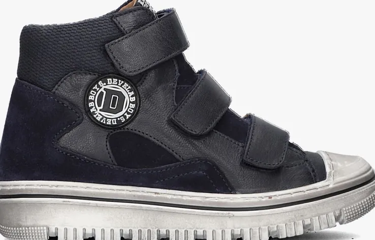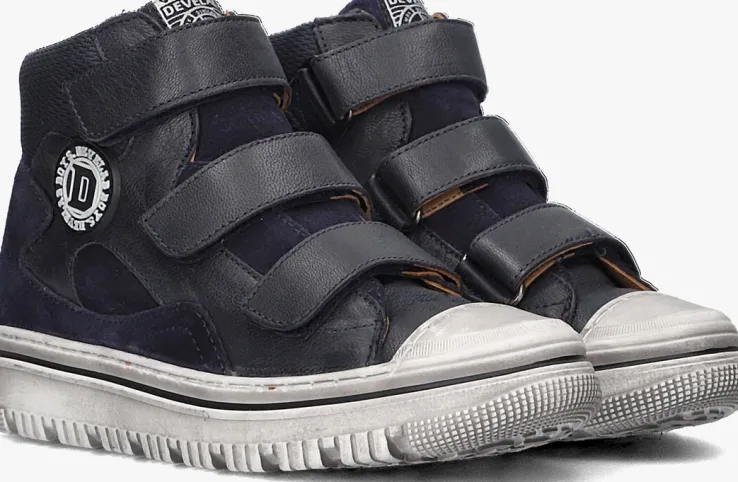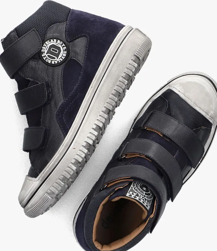 Deze hoge sneaker van het merk DEVELAB is super leuk voor jouw kleintje! De donkerblauwe sneaker is gemaakt van stevig leer die in combinatie met de used-look, rubberen stootneus zorgt voor een lange levensduur. Door de driedubbele klittenbandsluiting trek je ze gemakkelijk aan en uit. Opvallende details zijn de suède panelen op de zijkant en de enkelkraag van gevoerd mesh voor optimaal comfort aan de enkel. De witte rubberen zool heeft een stoere used-look en een gripvast profiel door de vierkantjes. Het binnenwerk is gevoerd met leer en het zachte voetbed is uitneembaar! De merkemblemen zijn te vinden op de zijkant en de tong.