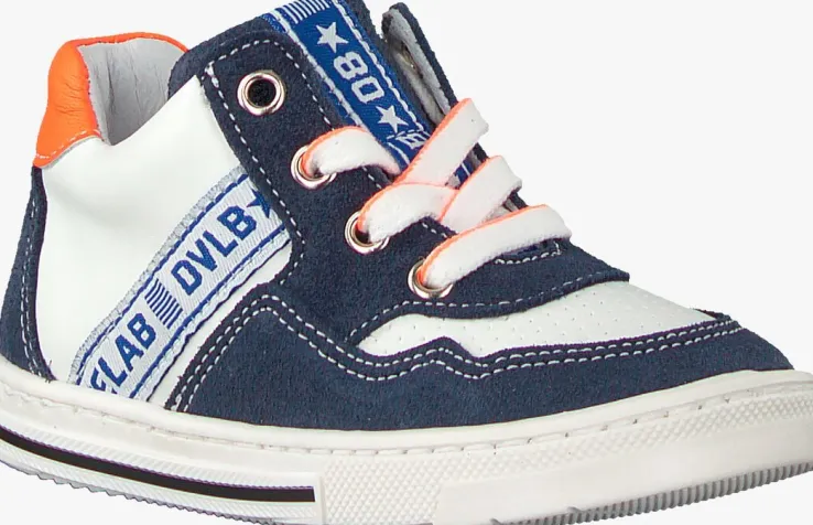 Deze lage sneaker 41307 komt uit de collectie van het merk DEVELAB. De buitenkant is gemaakt van wit leer met perforaties op de neus en donkerblauwe suède afwerking. Opvallend detail zijn de oranje accenten aan de hiel en de veters. Op de tong en aan de zijkant van de schoen is een textiel label met merkopdruk bevestigd. Het binnenwerk heeft een leren voering met een uitneembaar voetbed. De rubberen zool heeft een zwarte accentstreep en een gripvast profiel.