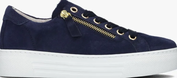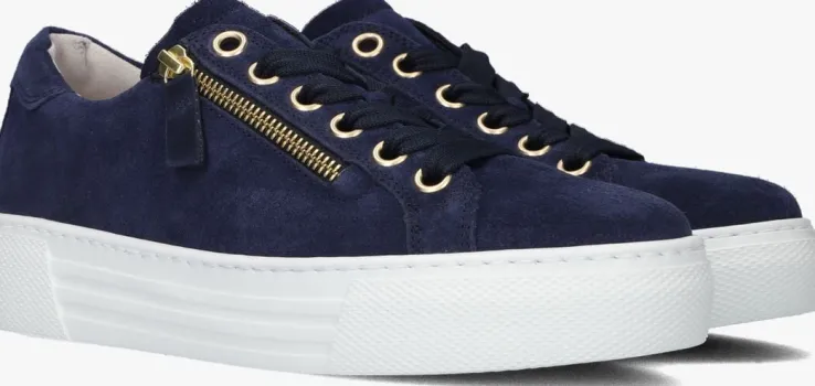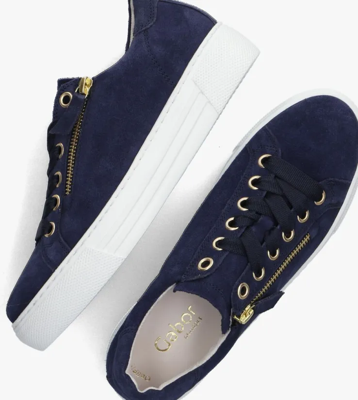 Deze donkerblauwe lage sneaker 465komt uit de Comfort collectie van het merk GABOR. Comfort schoenen hebben meer volume bij de tenen en bij de bal van de voet en bieden voor iedere voet de noodzakelijke ruimte. Dit model is uitgevoerd in hoogwaardig suède en is afgewerkt met goudkleurigeaccenten, de rits, de metalen veterringetjes en het inzet stuk op de hiel. De binnenvoering is een combinatie van suède en badstof en het voetbed is uitneembaar. Met de handige ritslangs de veterklep trek je ‘m makkelijk aan en uit. De schoen heeft een plateau zool van 4 centimeter dik met een gestreept reliëf op de zijkant en stootranden van reliëf rondom de neus en hiel. Dit model is gemakkelijk te combineren met een stoere jeans.