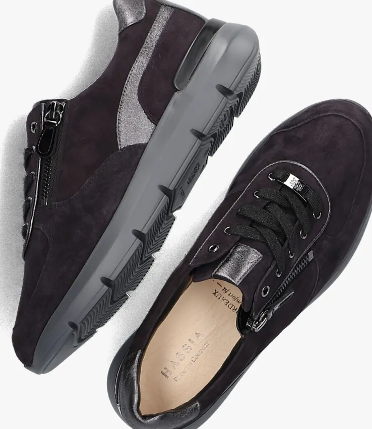 Met de HASSIA 1313 lage sneakers in het donkerblauw ben jij klaar om de wereld te veroveren! Deze trendy schoenen zijn perfect voor dames die stijl en comfort willen combineren. Stap vol vertrouwen de dag tegemoet met deze must-have sneakers aan je voeten. Of je nu een dagje gaat shoppen met vriendinnen of een casual avondje uit hebt gepland, met de HASSIA 1313 ben je altijd on-trend. Extra tof is het glanzende patroon op de hielcap, de zijkant en in de veters. Combineer ze met een stoere jeans en een oversized sweater voor een relaxte look, of draag ze onder een jurkje voor een trendy twist. Met deze sneakers maak je elke outfit compleet!
