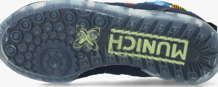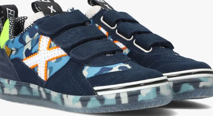 Life is too short to wear boring shoes! Het merk Munich maakt alles behalve saaie schoenen, dat zie je ook terug in deze blauwelage sneakerG3 VELCRO. De buitenkant is gemaakt van textiel met stoere legerprint met donkerblauwe panelen van suède en rubberen details. Aan de zijkanten bevindt zichhet bekende X logo gemaakt van wit leer met oranje biesjes en speelse kartelrandjes.De hiel is afgewerkt met een neongroene hielcap met merkreliëf en een donkerblauwe verstevigende hielinzet voor enorm veel steun aan de voet. Met de textiele aantreklusjes op de tong en hiel in combinatie met de driedubbele klittenbandsluiting trek je dit model super snel aan-en uit. Extra fijn is zwart-wit neusstuk wat slijtage voorkomt. Het binnenwerk is gemaakt van textiel en heeft een uitneembaar voetbed. De semi-transparanterubberen zool met blauwe legerprint en grof profielmaakt het helemaal af. Maak je outfit compleet met deze té gekke sneaker!