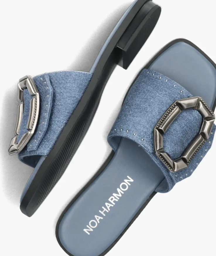 Stap in stijl met de blauwe denim slippers van NOA HARMON, model 9736. Deze trendy schoenen zijn perfect voor een dagje strand of een zomerse wandeling. De bovenkant is van denim stof en heeft een zilverkleurig element met klein ronde studs. De binnenkant is van blauw leer, heeft een zacht dempend voetbed. De zool is van rubber en heeft een gripvast en ondersteunend profiel. Met deze slippers ben je helemaal klaar voor de warme dagen die komen gaan. Laat je voeten ademen en geniet van het comfort en de stijl die deze slippers te bieden hebben. Perfect voor dames die houden van een mix van comfort en fashion.