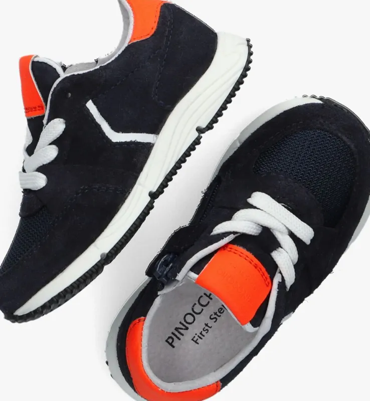 Supertoffe sneakers voor superstoere kleine boys! Ditmodel F1584 van het merk PINOCCHIO is uitgevoerd in donkerblauw suède en heeft coole neonoranje details.De neus is uitgevoerd in ademend mesh en op de zijkant is een witte leren bies te vinden. Dit sneakertje heeft een veter- én een ritssluiting, waardoor aan- en uittrekken supereenvoudig is. Het binnenwerk en het uitneembare voetbed zijn gemaakt van leer en de zwarte zool heeft diepe groeven voor een goede flexibele grip. Combineer ze met een stoere jeans en jouw kleine man is ready to go!