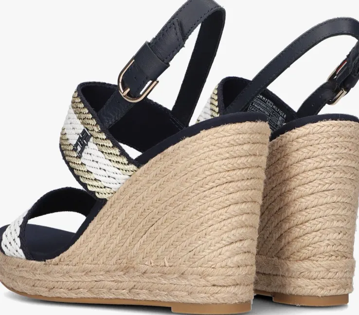Uit de collectie van het Amerikaanse merk TOMMY HILFIGER isdeze toffe donkerblauwe sandaalGOLDEN WEBBING met sleehak. Je benen lijken er super lang door en ze lopen ook nog eens erg comfortabel! Met het donkerblauwe enkelbandje met handige gespsluiting maak je ‘m eenvoudig passend naar jouw voet. De sandaal is uitgevoerd in donkerblauw textiel met twee banden over de voorvoet en wreef. Deze banden zijn afgewerkt met wit en goudkleurig textiel. De sleehak is afgewerkt met gevlochten jute en past perfect bij de rest van de sandaal! Het licht opgevulde, canvas voetbed is voorzien van een leren inzet met merkopdruk onder de hiel. Hetplateau is 2,5 centimeter dik onder de voorvoet zorgt ervoor dat jeer lange zwoele zomeravonden comfortabel mee door kunt komen. De sleehak heeft een hakhoogte van 11centimeter en dankzij de rubberen loopzool ervaar je veel grip en stabiliteit. Combineer ‘m onder jouw favoriete zomerse outfit voor een mooie elegante look met vrouwelijke uitstraling!