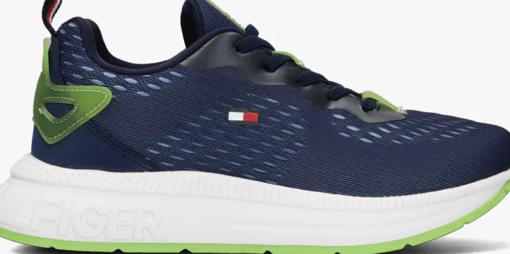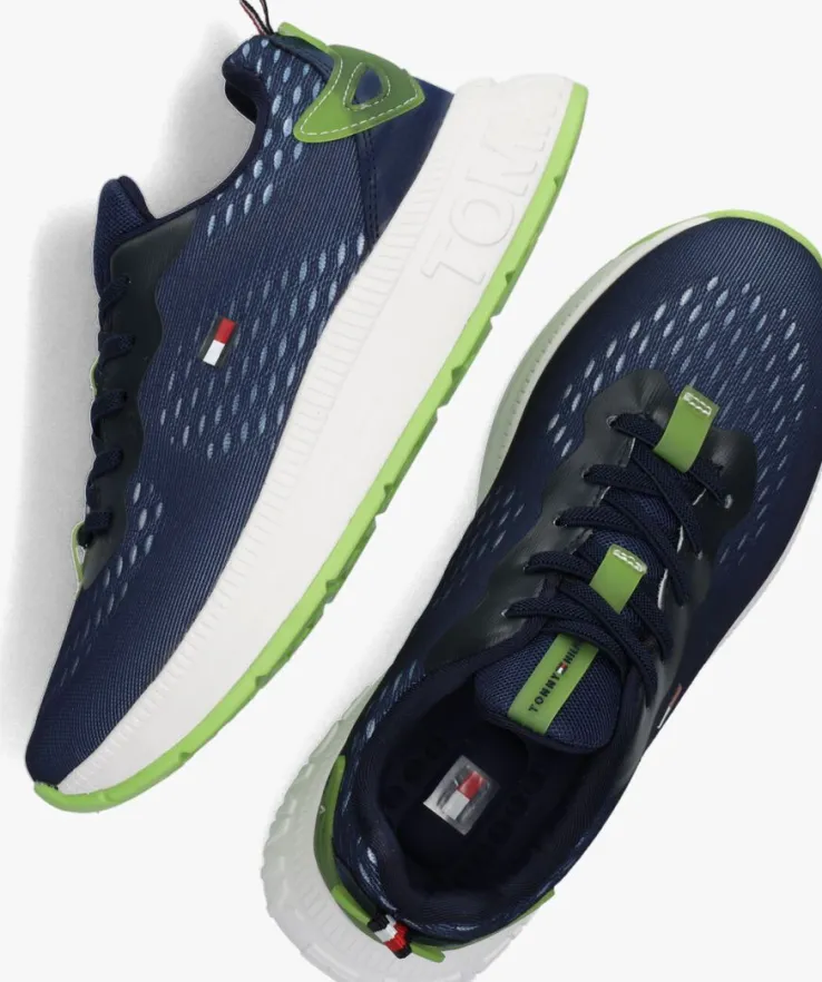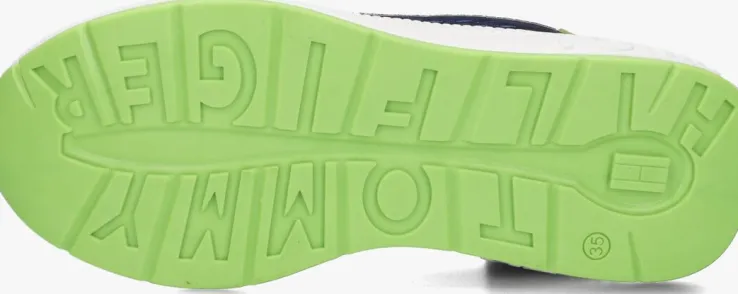 Deze sportieve sneaker 32892 komt uit de collectie van Tommy Hilfiger en is uitgewerkt in donkerblauw textiel met een tong van mesh en heeft groene, rubberen accenten. Het merkembleem is te vinden op de tong en zijkant. Extra leuk is het textieltape lusje op de hiel en de rubberen aantreklus. Je trekt de sneaker gemakkelijk en snel aan, want de veters zijn elastisch! De binnenkant is gemaakt van zacht textiel en het zachte voetbed is uitneembaar. De witte zool is gemaakt van rubber en heeft een oversized merkembleem bij de hiel. De groene loopzool met een groot merkopdruk heeft een gripvast profiel en zorgt voor voldoende steun en stabiliteit bij al je activiteiten!