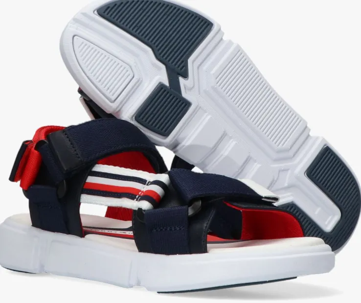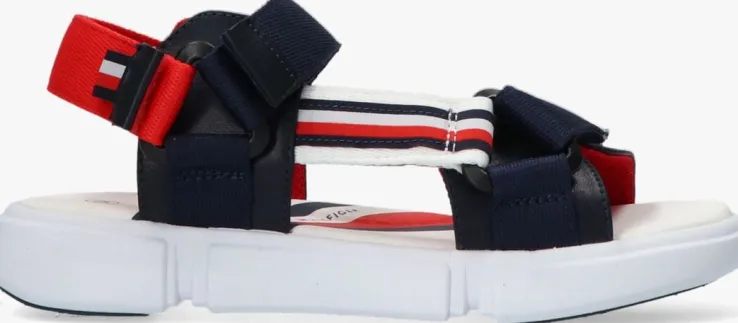 Met een stoere en stevige sandaal ben jij klaar voor alle fijne dagen buiten. Dit model 31111 komt uit de collectie van het merk Tommy Hilfiger en heeft een stoere look dankzij de grove banden en opvallende zool. Het bovenwerk isuitgevoerd in donkerblauw lederlook in combinatie met rood, wit en blauwe textiel banden met een klittenbandsluitingaan de voorvoet,wreef en hiel waardoor je ‘m niet alleen heel gemakkelijk aan-en uittrekt maar ook nog eens perfect afstelt aan je voet. De zijkant is gesierd met eenlogotape.Het binnenwerk heeft eenrodemeshvoering en een rubberen voetbedmet merkopdruk en extra ondersteuning. De zool is gemaakt van rubber, is flexibel en voorzien vanchunkyvormen wat de stoere look benadrukt. Hetgripvasteprofiel zorgt voor een stevige grip.