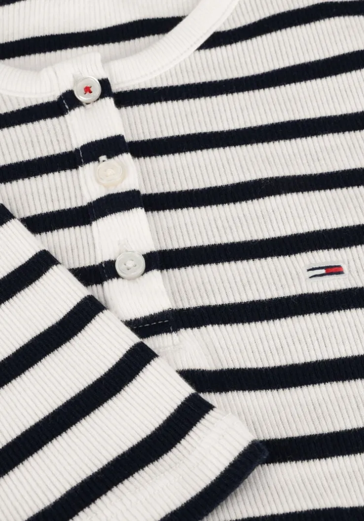 Ontdek de veelzijdigheid van de TJW SLIM BUTTON RIB C-NECK LS EXT longsleeve van Tommy Jeans. Deze blauw/wit gestreepte longsleeve is perfect voor dames die houden van een casual en stijlvolle look. Draag ‘m tijdens een ontspannen dagje shoppen of een gezellige lunch met vriendinnen. De subtiele knoopdetails en de slanke pasvorm geven je outfit net dat beetje extra flair. Combineer deze longsleeve moeiteloos met een strakke jeans of een elegante rok voor een complete look. De zachte ribstof zorgt voor comfort, terwijl de klassieke strepen tijdloos blijven. Voeg een vleugje Tommy-stijl toe aan je garderobe!