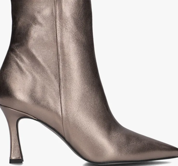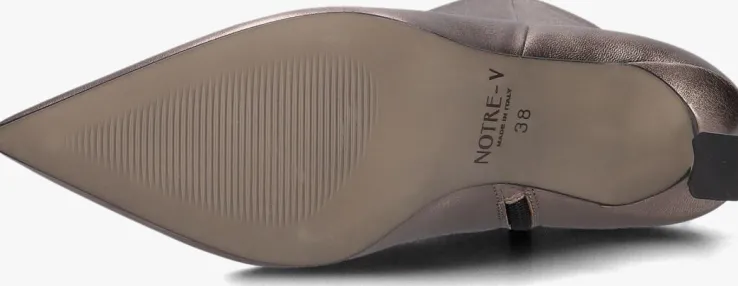 Ga voor een chique look met deze enkellaars 19536 van het toffe merkNOTRE-V!Dit modelheeft een bovenwerk van hoogwaardig leer in een mooie, bronzen kleur. De laars heefteen rechte schacht met een handige ritssluiting aan de binnenzijde om ‘m gemakkelijk aan en uit te trekken. Opvallend detail is de naar binnen gestikte naad aan de schacht en de goudkleurige ritshanger met merkreliëf. Verder heeft dit item een trendy puntige neus met een kittenheel van zo’n 8 centimeter hoog. Het binnenwerk bestaat uit zacht leer in combinatie met leatherlook dat comfortabel aanvoelt aan je voeten en de schoen heeft een vast voetbed. De kunststof loopzool geeft de laars een mooi afgewerkt geheel en met het fijne lijntjesprofiel heb je een goede grip. Deschacht is 15 centimeter hoog, gemeten bij maat 38. Draag de schoenen elegant onder eenjurkje of stoer onder een jeans!