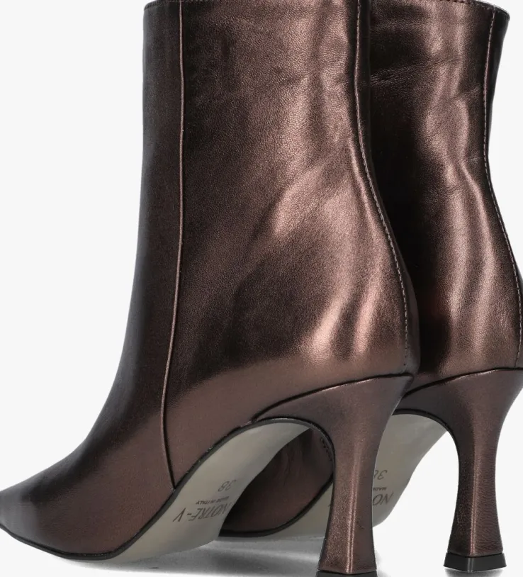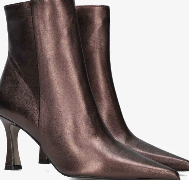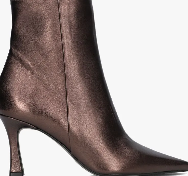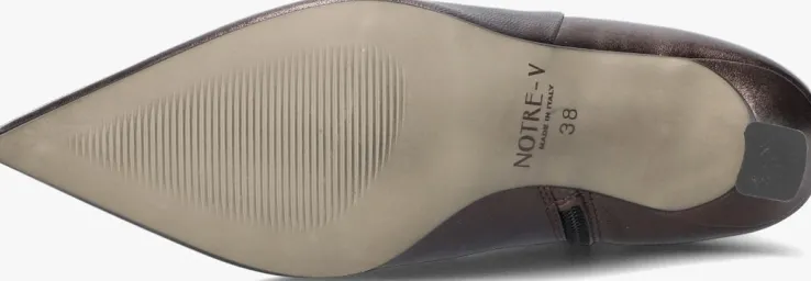 Ga voor een chique look met deze enkellaars 19536 van het toffe merkNOTRE-V!Dit modelheeft een bovenwerk van hoogwaardig leer in een mooie, bronskleurige kleur. De laars heefteen rechte schacht met een handige ritssluiting aan de binnenzijde om ‘m gemakkelijk aan en uit te trekken. Opvallend detail is de naar binnen gestikte naad aan de schacht en de goudkleurige ritshanger met merkreliëf. Verder heeft dit item een trendy puntige neus met een kittenheel van zo’n 8 centimeter hoog. Het binnenwerk bestaat uit zacht leer in combinatie met leatherlook dat comfortabel aanvoelt aan je voeten en de schoen heeft een vast voetbed. De kunststof loopzool geeft de laars een mooi afgewerkt geheel en met het fijne lijntjesprofiel heb je een goede grip. Deschacht is 15 centimeter hoog, gemeten bij maat 38. Draag de schoenen elegant onder eenjurkje of stoer onder een jeans!