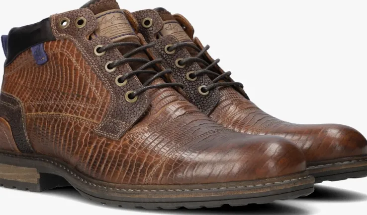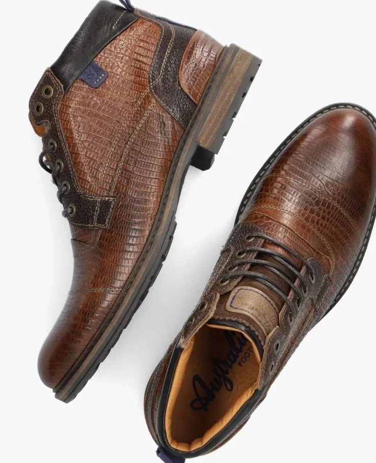 Bruine halfhoge veterboot MONTENEROmet snakeprintvan het merk Australian Footwear. Dit lichtgewicht model is uitgevoerd in glanzend slangenprint leer en heeft een binnenvoering van leer met een uitneembaar voetbed. De gladleren enkelkraagis opgevuld enbiedt ondersteuning en comfort. Opvallend detail is de snakeprint op het bovenwerk en de suède tong met ledermerkembleem. De stoererubberen zool met grof profiel heeft een leren tussenzool en loopt erg comfortabel.