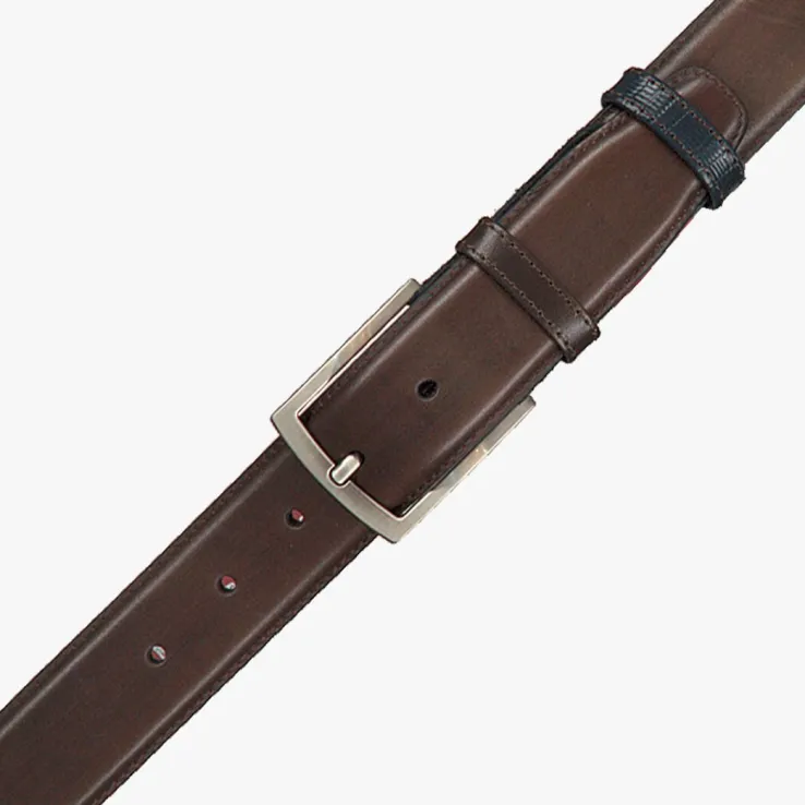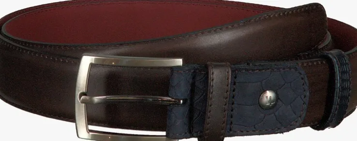 Donkerbruine riem 75160metmetalen gesp uit de collectie van het merk Floris van Bommel. Ditmodel is uitgevoerd inleer en voorzien van een blauwe nubuck inzet met slangenprint. De riem is 3,5centimeterbreed en afgewerkt met eenmetalen gesp, een zwarte rand,een metalen F-merkstud en een donkerrodelerenbinnenvoering. Jemaakt ‘mgemakkelijk op maatdoor de metalen gespsluiting te demonteren en op de juiste lengte terug te plaatsen. Draag ‘m in je jeans of pantalon en jouw outfit is perfect gestyled.Ook leuk om cadeau te geven!Combineer deze riem met de bijpassende dressed schoen 19062/02(Omoda-nummer 109345, indien voorradig) en je outfit is om door een ringetje te halen!