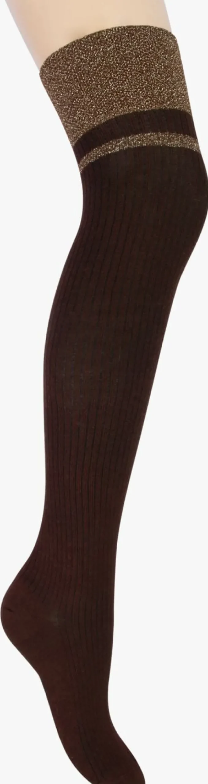 Met deze unieke sokken van het merk MARCMARCS heb je comfortabele fashion aan je voeten! Deze bruine overkneesokken CLAUDINEzijn uitgevoerd in bruin met een glitter streepdesign aan de bovenkant van de sok.Ze voelen zacht aan, hebben een ultiem draagcomfort en geven lekker veel warmte. De sokken zijn geproduceerd in Italië van hoogwaardige materialen en zien ze er fantastisch uit onder een jurkje, rok en in je lange laarzen!Doordat zehandgeketteldzijn voel je de naden niet zitten en dat zorgt voor een prettig draagcomfort. Materiaal: 75% katoen, 15% polyamide, 5% elastaan en 5% metaaldraad.
