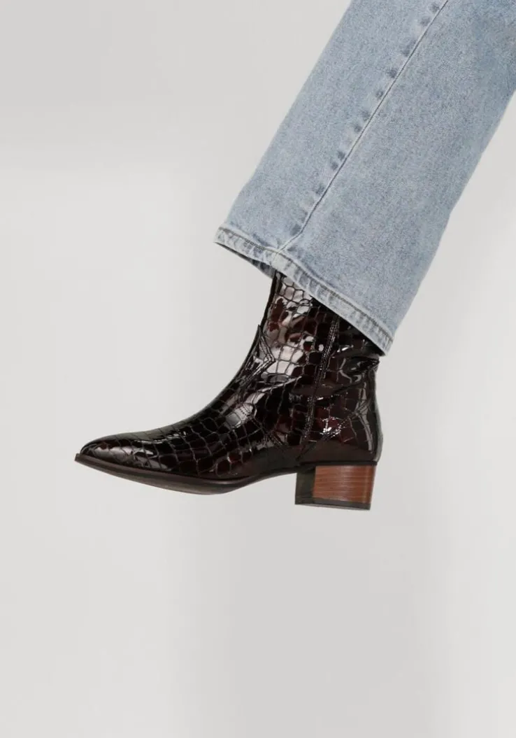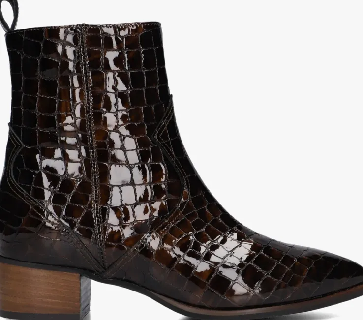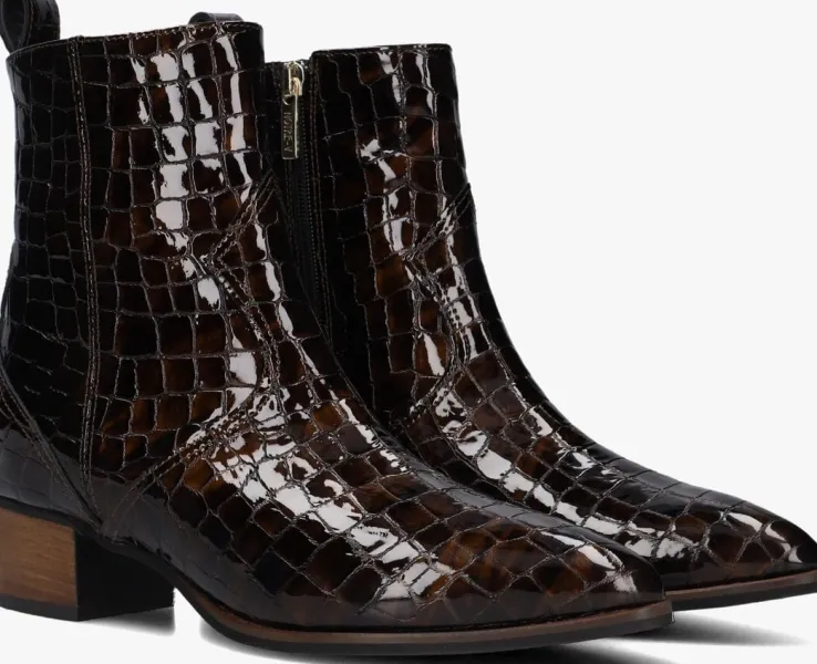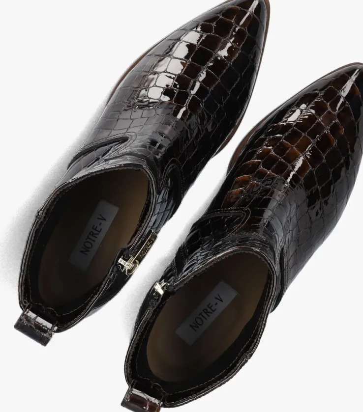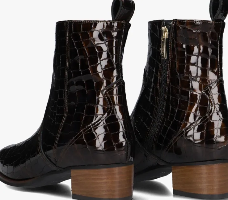 Stap stijlvol de dag in met de bruine lakleren enkellaarzen 3231 van NOTRE-V. Deze elegante schoenen zijn perfect voor een dag op kantoor of een avondje uit. De schoen heeft een krokodillen patroon, wat de schoen een speelse look geeft. Combineer ze moeiteloos met een strakke jeans of een chique rok voor een verfijnde look. De lakleren buitenkant geeft een luxe uitstraling, terwijl de stevige hak zorgt voor comfort en stabiliteit. Opvallend is de overlay en de aantreklus aan de achterzijde. Door de ritssluiting trek je ‘m gemakkelijk aan-en uit. Voeg deze veelzijdige enkellaarzen toe aan je garderobe en geniet van de perfecte mix van stijl en comfort.