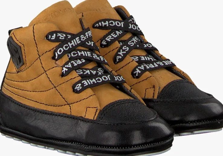 Het familiebedrijf JOCHIE & FREAKS maaktal sinds 1951 modieuze baby- en kinderschoenen. Dat doen ze met veelpassie, aandacht en ambacht. Alleen de beste materialen worden gebruikt en dat zie je ook terug in deze stoerebabyschoentjes. Zodra je kindje probeert te gaanlopen is het tijd voor een echtschoentje. Dit model 19060is gemaakt van camelkleur nubuck in combinatie met zwart leer. Stoere details zijn de zwarte stiksels, het vetertje met merkopdruk en de rubberen merkpatch aan de zijkant van de schoen.De voering is gemaakt van leer en heeft een vast voetbed. Het rubberen zooltje heeft een gripvast profiel en zorgt voor voldoende grip tijdens die nog wankelende stapjes, ondersteund bij het opstaan en buigt perfect mee met de voet voor een goede afwikkeling.