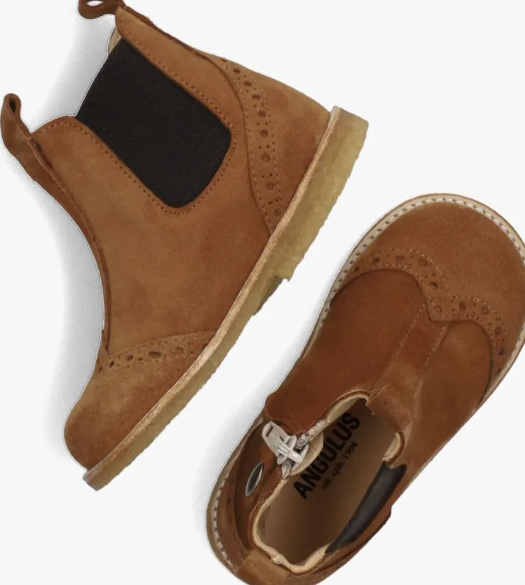 Het merk ANGULUS heeft zich al meer dan eens bewezen, het maakt namelijk al schoenen met de hand sinds 1904! Uiteraard altijd met de tijd meegegaan en nog altijd trendy zonder af te doen aan comfort. Want dat is hoe het allemaal begonnen is. Trends mogen er zijn maar ze moeten niet in de wegstaan voor comfort. Zeker niet bij groeiende kindervoetjes die volop in ontwikkeling zijn. Deze te leuke chelsea boots 6024 zijnuitgevoerd in cognac kleurig suède en heeft een mooie brogues decoratie aan de neus en hiel. De zijkant is voorzien van een elastieken inzet in combinatie met een ritssluiting voor extra gemak tijdens het aan- en uittrekken. Het binnenwerk heeft een leren voering met een vast voetbed en voelt comfortabel aan. De rubberen crêpezool is flexibel en buigt fijn mee met de voet en zorgt tegelijkertijd voor een goede grip en stabiliteit. Aan alles zie je dat ook dit schoentje uit de collectie gemaakt is van de hoogste kwaliteit materialen en met grote passie en vakmanschap.