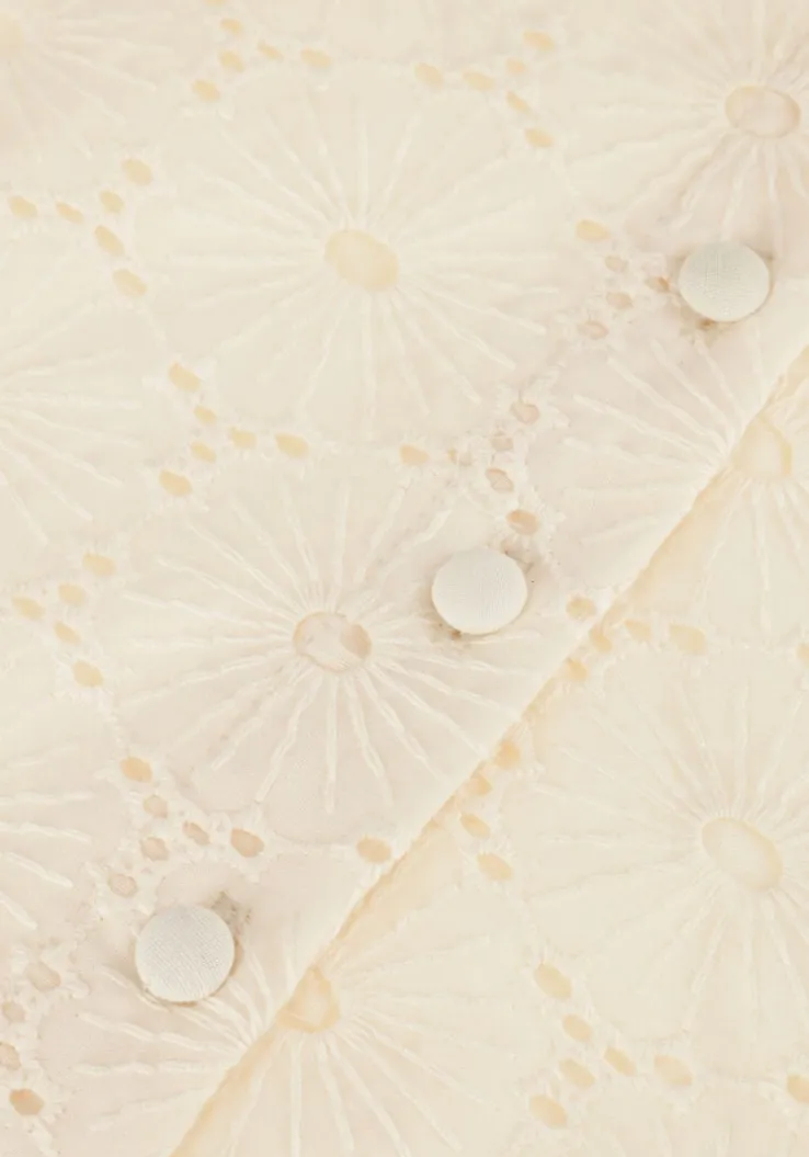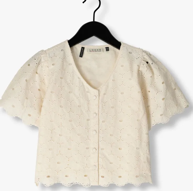 Met deze ecru LOOXS 10sixteen top ben jij helemaal on-trend! Deze ecru kleurige top heeft een broderie patroon met aan de voorkant speelse knoopjes. De top heeft een speels design en is perfect te combineren met een high-waisted jeans voor een casual look. Met deze top ben jij klaar voor elke gelegenheid!