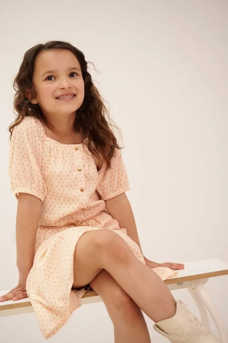 Ontdek de schattige MOAS HEART DRESS van NONO, speciaal voor meisjes die houden van stijl en comfort. Deze ecru mini jurk is perfect voor een dagje uit met vriendinnen of een feestje. De zachte stof en speelse hartjesprint maken het een favoriet in elke garderobe. Combineer met een paar stoere sneakers voor een casual look of kies voor elegante ballerina’s voor een feestelijke touch. Deze jurk past ook prachtig bij een denim jasje voor de koelere dagen. Laat je creativiteit de vrije loop en creëer eindeloze combinaties met deze veelzijdige must-have!