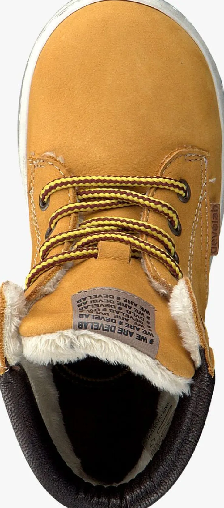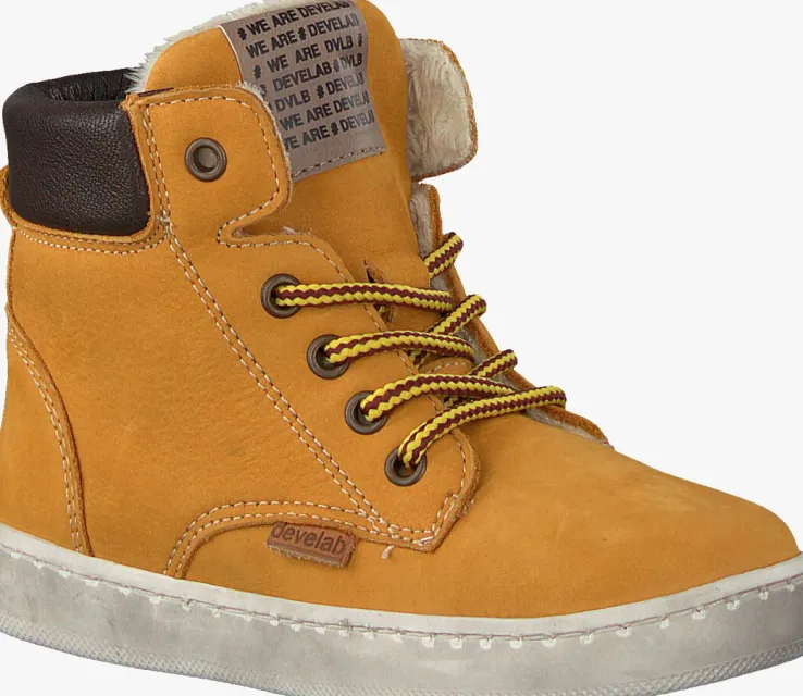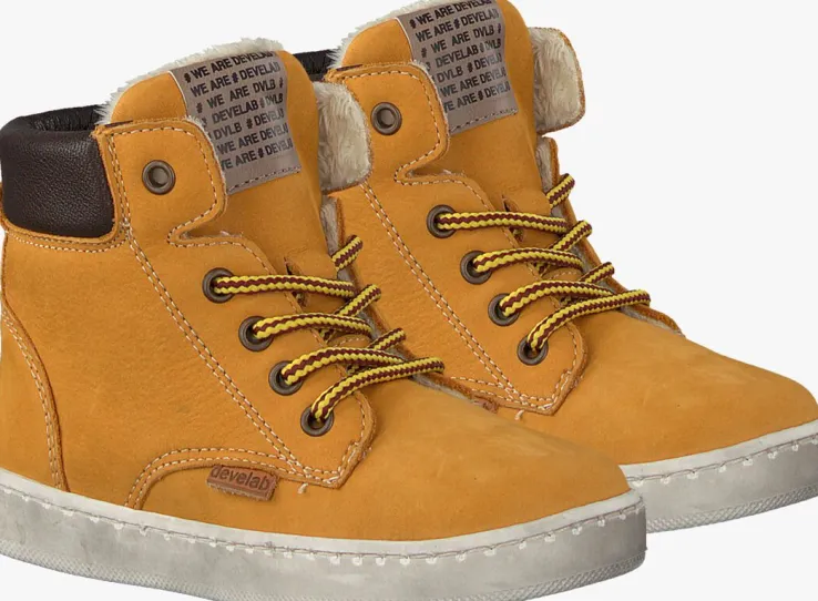 Deze stoere schoentjes 41855 van het Nederlandse merk DEVELAB staan te trappelen om op avontuur te gaan. Heb jij zo’n ondernemend jochie in huis? Ga dan voor deze camel kleurhoge sneaker die aan de buitenzijde gemaakt is van nubuck. De opgevulde enkelkraag is gemaakt van donkerbruin leer en de tong is gesierd met een merklabel. Opvallend zijn de stoere ronde tweekleurige veters. Het binnenwerk is uitgevoerd met een heerlijk zacht faux fur voering welke net iets boven het schoentje uitsteekt en zorgt voor die unieke look. Het voetbed is gemaakt van leer en tevens uitneembaar. De rubberen zool is flexibel en heeft een gripvast profiel. Een fijn schoentje waar je kind veel steun en grip in ervaart maar ook de flexibiliteit die hij nog nodig heeft.