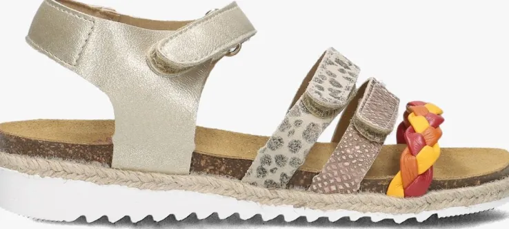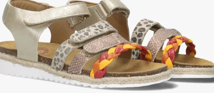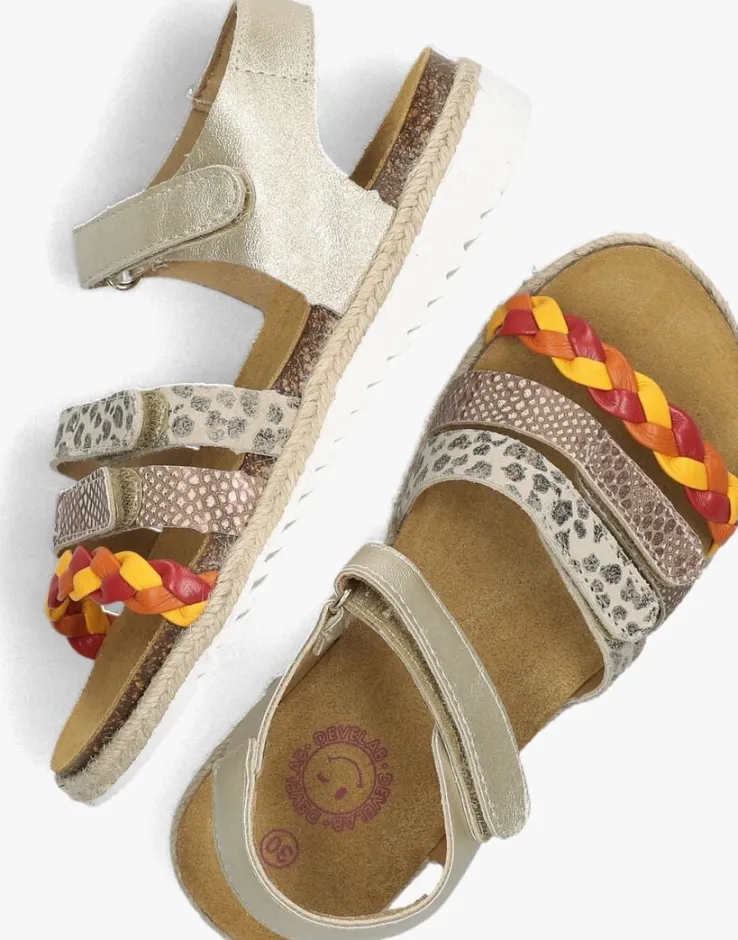 Stap in stijl met deze goudkleurige sandalen van DEVELAB! Met de 44332 ben jij helemaal klaar voor de zomer. De sandaal heeft multi-kleurige klittenband bandjes over de wreef en gevlochten touw bij de zoolrand. De binnenkant is van leer en textiel, geeft je de comfort die je nodig hebt. De witte rubberen zool heeft ene gekarteld profiel en is gripvast. Combineer ze met een luchtige zomerjurk voor een trendy look, of draag ze onder een stoere jeans voor een casual uitstraling. Of je nu naar het strand gaat of een dagje gaat shoppen, met deze sandalen loop jij er altijd fashionable bij. Laat die zon maar komen!