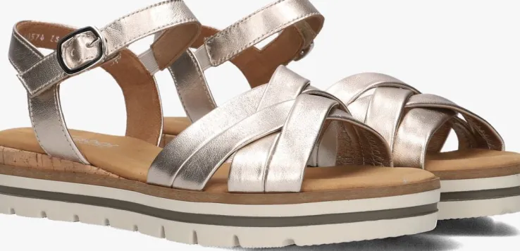 Stap in stijl met deze prachtige goudkleurige sandalen van Gabor. De sandalen, genaamd 083.3, zijn perfect voor een zomerse dag in de stad of een ontspannen strandwandeling. Deze sandalen zijn gemaakt van zacht goudkleurig leer met losse bandjes over de wreef. De sandaal heeft een gesp sluiting zodat de schoen aan de voet sluit. Met zijn zachte binnenkant van leer en zijn comfortabele zachte kussentjes in het voetbed, zijn deze sandalen een must voor je voeten! De hak is 4 centimeter hoog en heeft een gripvaste loopzool en kan je moeite flaneren op deze eyecatchers.