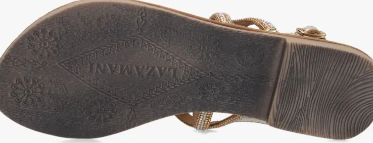 Met sandalen aan je voeten van het merk LAZAMANI ben je verzekerd van eentrendy look in combinatie met een hoog comfortabel gevoel. Alleitems uit de collectie van dit merk zijnvoorzien van een verrassende twist. Dat zie je ook zeker weer terug in deze goudkleurige sandaal 33.543. Het bovenwerk is gemaakt van glanzend leer en heeft een mooie decoratie op de voorvoet en wreef met strass steentjes en kraaltjes. Het bandje om de enkel is voorzien van een gespsluiting waardoor je ‘m gemakkelijk aan- en uittrekt en de sandaal goed aan je voet blijft zitten. Het binnenwerk is leer gevoerd en de het voetbed met reliëf merkopdruk heeft een fijne suède afwerking met schuimvulling voor een heerlijk zacht en comfortabel gevoel. De rubberen zool is flexibel waardoor hij fijn meebuigt met de voet en is voorzien van een fijn maar gripvast profiel. Een heerlijke sandaal voor allezonnige dagen met een mooie decoratie voor die extra vrolijke touch onder al je outfits!