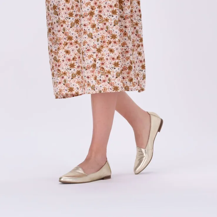 De elegante Italiaanse ontwerpen van het merk NOTRE-V zijn er voor de verfijnde vrouw die er graag effortless chic uit wil zien. De producten zijn gemaakt van luxe materialen met subtiele accenten en een knipoog naar de laatste trends. Met deze klassieke loafer 43576 maak jij je outfit af en zorg je voor een elegante touch. De buitenkant is uitgevoerd in metallic goudkleurig leeren heeft een mooi en eenvoudig silhouet. De voering is gemaakt van leer met een vast voetbed en een licht opgevuld vast voetbed. Het kleine gelaagde hakje vanruim 1centimeter dik heeft net als de loopzool een rubberen afwerkingen is voorzien van een fijn profiel.