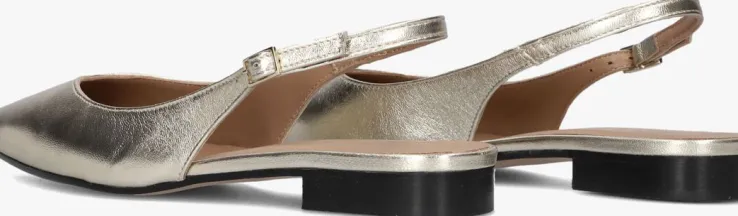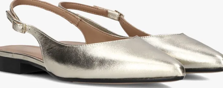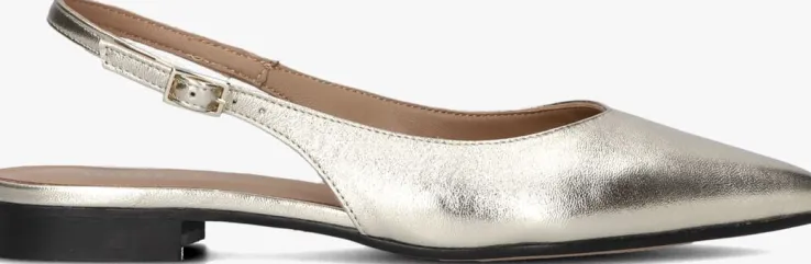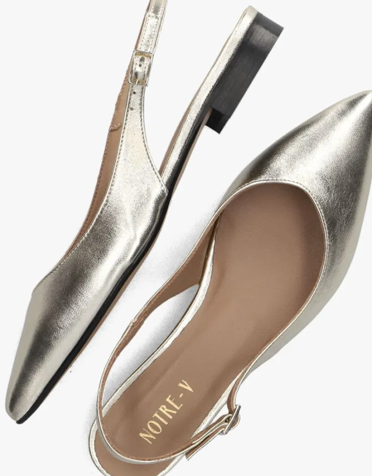 Stap in stijl met deze goudkleurige slingbacks van NOTRE-V, model 08-231. Het bovenwerk bestaat uit goudkleurig leer en loopt in een mooie punt. Deze schoenen zijn perfect voor dames die op zoek zijn naar een chique en elegante touch aan hun outfit. Dankzij de kleine gespsluiting bij de enkel blijft dit model goed aan je voet zitten. Met deze slingbacks maak je zeker een statement en steel je de show waar je ook gaat.