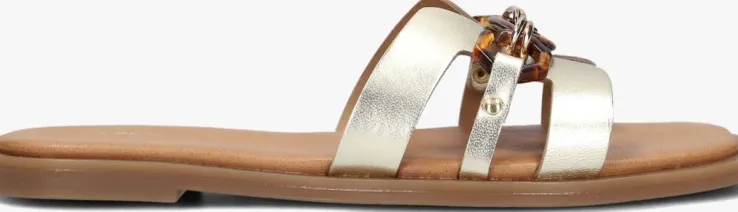 Als je het over hippe slippertjes hebt, dan is de 180H van het merk NOTRE-V er zeker één! Deze goudkleurige slipper is gemaakt van luxe materialen met opvallende accenten en een knipoog naar de laatste trends. Het bovenwerk heeft een brede band van soepel leer met een chain detail van resin, metallic en houtlook voor een chique touch.Het binnenwerk is gemaakt van zachtleer met een gevoerd voetbed voor extra ondersteuning en optimaal loopcomfort. De flexibelerubberen loopzool heeft een laag hakje van ongeveer 2 centimeter hoog en eenfijn lijntjes profiel voor extra grip tijdens al je wandelingen door de stad of over een zonnige boulevard.
