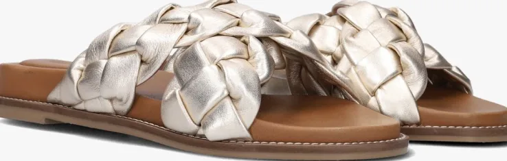 De Italiaanse ontwerpen van het merk NOTRE-V zijn er voor de moderne vrouw die graag gekleed gaat volgens de laatste trends. De producten zijn gemaakt van kwalitatieve materialen met subtiele accenten en een mooie afwerking. Deze zomerse, goudkleurige slipper 906009 is gemaakt van gevoerd leer met twee brede, gevlochten banden over de wreef. Het binnenwerk is gemaakt van soepel, zacht leer en heeft een dempend voetbed met een extra inzet onder de hiel voor veel comfort. De rubberen loopzool heeft een laag hakje van 1,5 centimeter en een fijn profiel voor voldoende stabiliteit. Combineer deze slipper onder jouw favoriete zomerjurk of draag ze onder een toffe short!