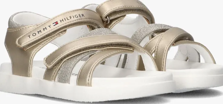 Stap in stijl met deze goudkleurige sandalen van TOMMY HILFIGER. Perfect voor meisjes die willen stralen deze zomer! De sandaal is afgewerkt met merkreliëf en heeft glitterpanelen bij de hiel en voorvoet, is gemakkelijk aan te trekken met de klittenbandsluitingen. Met zijn zacht leatherlook binnenwerk en witte rubberen zool is comfortabel en gripvast. Combineer ze met een zomerjurkje voor een trendy look of draag ze onder een jeans voor een casual uitstraling. Met deze sandalen ben je klaar voor elke gelegenheid, van een dagje strand tot een avondje uit. Laat je voeten schitteren en geniet van het comfort en de kwaliteit die deze schoenen bieden. Maak je outfit compleet met deze eyecatchers en steel de show waar je ook gaat!