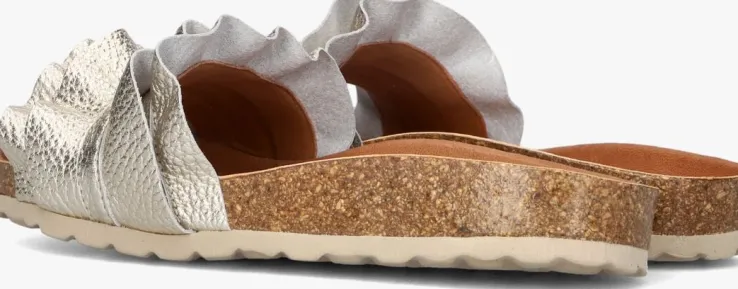 Het merk VERBENAS maakt alle collecties op ambachtelijke, authentieke wijze. Deze toffe slipper ROCIO heeft een band van goudkleurig leer met ruffles. Het voorgevormde, leren voetbed heeft een fijne demping en zorgt voor een hoog draagcomfort. De zoolrand van kurk geeft deze slipper een extra zomerse look en de rubberen, flexibele loopzool heeft een gripvast profiel voor voldoende stabiliteit. Trotseer alle zonnige boulevards en terrassen op deze elegante slippers!