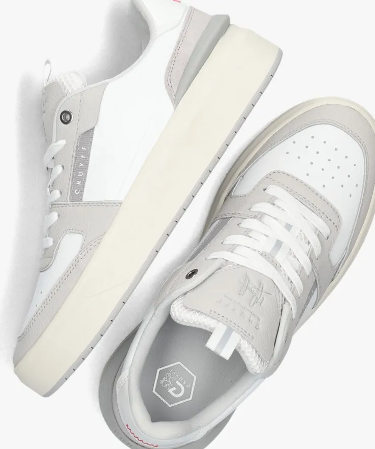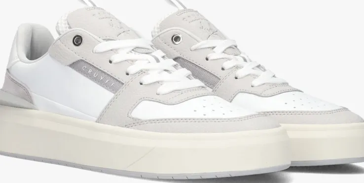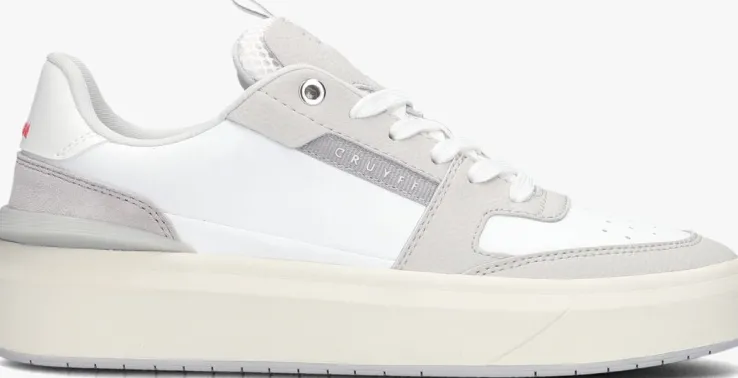 Stap in stijl met de CRUYFF ENDORSED TENNIS VARSITY lage sneakers voor dames. Deze witte sneakers zijn gemaakt van leer en heeft grijze panelen van leatherlook. Extra tof zijn de perforaties op de voorvoet, de mesh tong en de lakleatherlook hielcap. De rubberen zool zorgt voor grip en comfort, terwijl het uitneembare voetbed zorgt voor extra gemak. Combineer deze sneakers met een jeans en een basic t-shirt voor een trendy en sportieve uitstraling. Perfect voor een dagje shoppen of een lunchdate met vriendinnen!