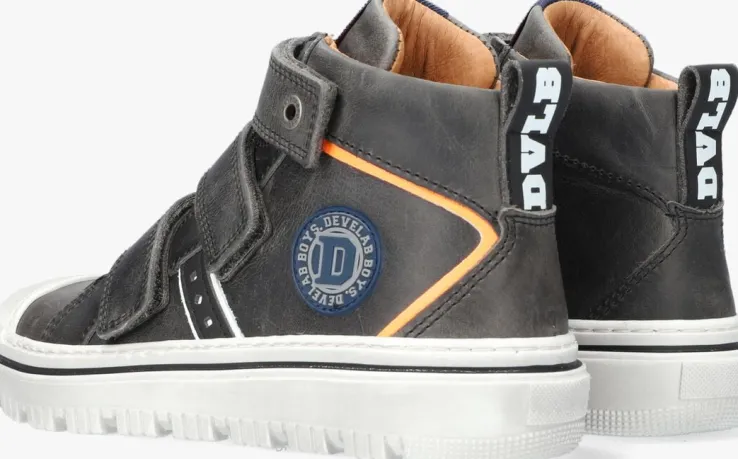 Stoere hoge sneakers zijn een musthave voor alle stoere jochies. Ga voor dit toffe model 41935 uit de collectie van het merk DEVELAB. De buitenkant is gemaakt van grijs leer en heeft een rubberen afwerking op de neus waardoor de neus veel minder snel slijt en de schoen langer mooi blijft ondanks al die klim en klauter avonturen. De enkelkraag is afgewerkt met een handige aantreklus met merk opdruk en in combinatie met de klittenband sluitingen kan je zoontje hem gemakkelijk zelf aan-en uittrekken. Op de tong bevind zich een textiel merklabel en op de zijkant is een rubberen merkbatch te vinden. Extra leuk detail is het neon oranje paneel langs de schacht. De binnenkant heeft een leren voering met een uitneembaar voetbed. De rubberen zool heeft een used look wat de stoere look benadrukt en heeft een gripvast profiel.