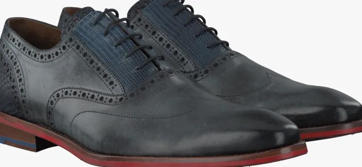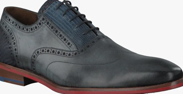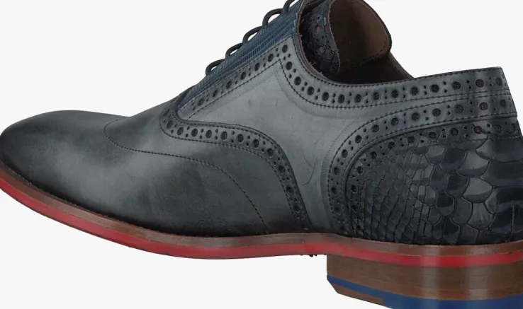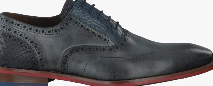 Uit de collectie van het Nederlandse merk Floris van Bommel is deze donkergrijze nette schoen 19062met opvallende accenten zoals de lizardprint op de veterklep, de snakeprint op de donkerblauwe tong en hielinzet en de klassieke brogue perforaties op hetbovenwerk. Ditmodel is uitgevoerd in luxe kalfsleer met een bruine leren binnenvoering en een leren inzet onder de hiel.De donkerrode rubberen zool heeft een schoentjesprint en de rode kleur is ook aan de zijkant van de schoen zichtbaar. Het loopvlak van de hak is opgedeeld in een vlak slijtvast rubber en een vlak leer. Het model heeft een normale pasvorm met een G+-wijdte en het voetbed is niet uitneembaar.Een klassieke, elegante schoen waar je alle kanten mee op kunt!