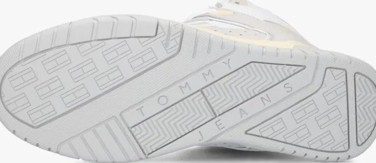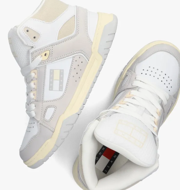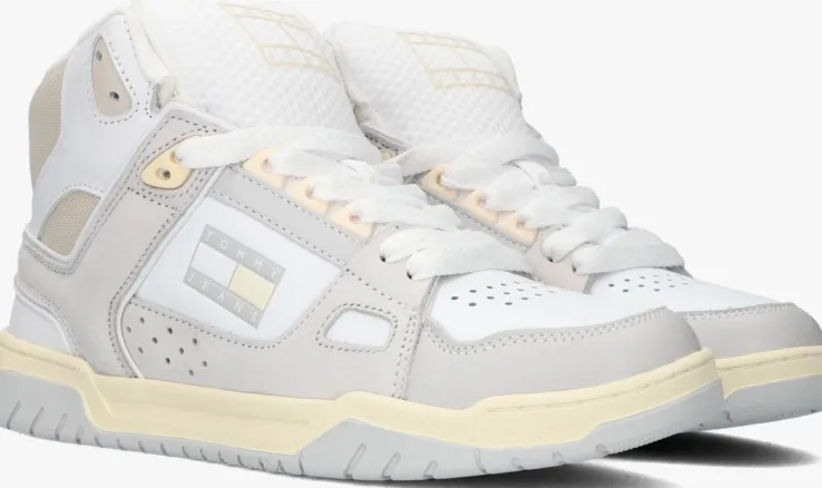 Van het sportieve Amerikaanse merk TOMMYJEANS is deze hoge sneaker MEG LOW van wit leer in combinatie met grijze panelen en heeft de sneaker een beige achterpand. De zijkant van de schoen is voorzien van het welbekende vlaglogo, zit er op de tong een beige merkopdruk, heeft de sneaker grove perforaties op de neus en geeft de kuipzool hem een fantastische retro touch. Extra opvallend is de gewatteerde tong van textiel en de gele veterringetjes. Het binnenwerk is gemaakt van 100% gerecycled polyester en heeft een uitneembaar voetbed met prettige demping en desneaker loopt erg comfortabel doordeflexibele zool. De zoolrand is gesierd met merkreliëf en degrijze loopzool met gripvast profiel zorgt voor een comfortabel gevoel en een goede grip bij iedere stap. De perfecte sneaker voor fijne uitstapjes!