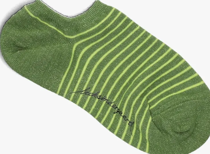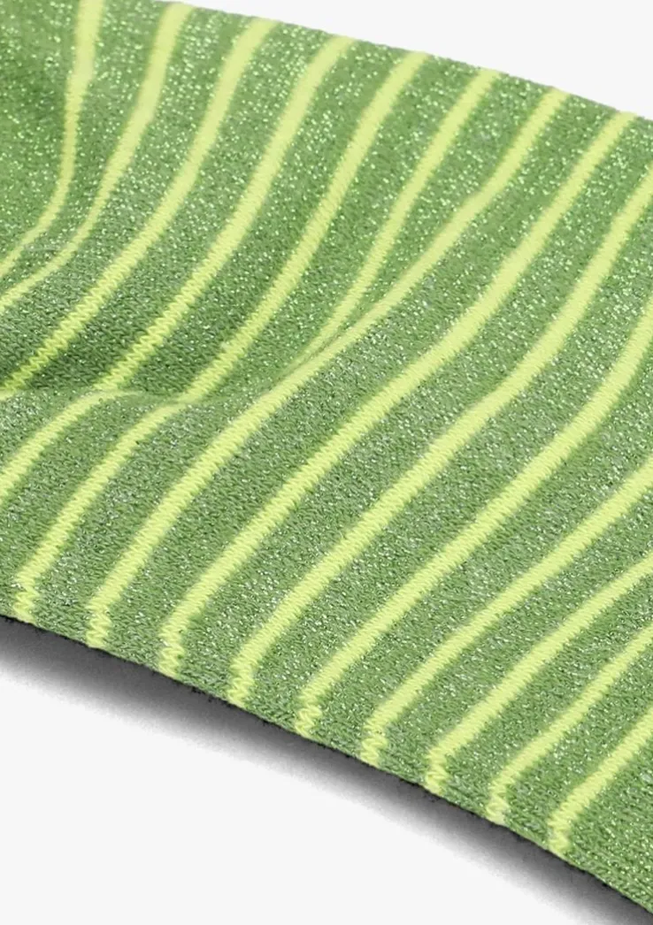 Deze groene glitter sokken hebben gele strepen en zijn gemaakt van 50% katoen, 20% metallic, 20% polyester en 5% elastaan.