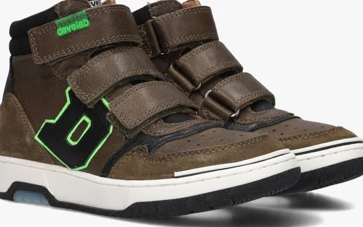 Deze hoge sneaker 44307 komt uit de schoenencollectie van het merk DEVELAB en is uitgewerkt in groen met zwarte en neongroene accenten. De enkelkraag en hielcap zijn afgewerkt met mesh textiel en zwart leer met en stoere merkopdruk. Leuke details zijn de merkemblemen op de tong, zijkant en het rubberenlabeltje op de klittenbandsluiting, waarmee je ‘m ook nog is gemakkelijk aan en uit trekt. Je ervaart extra comfort door de opgevulde enkelrand en tong. De binnenkant is gemaakt van leer en het voetbed is uitneembaar. De zwarte zool heeft grijze en witte inzetten en heeft een gripvast profiel.