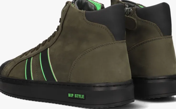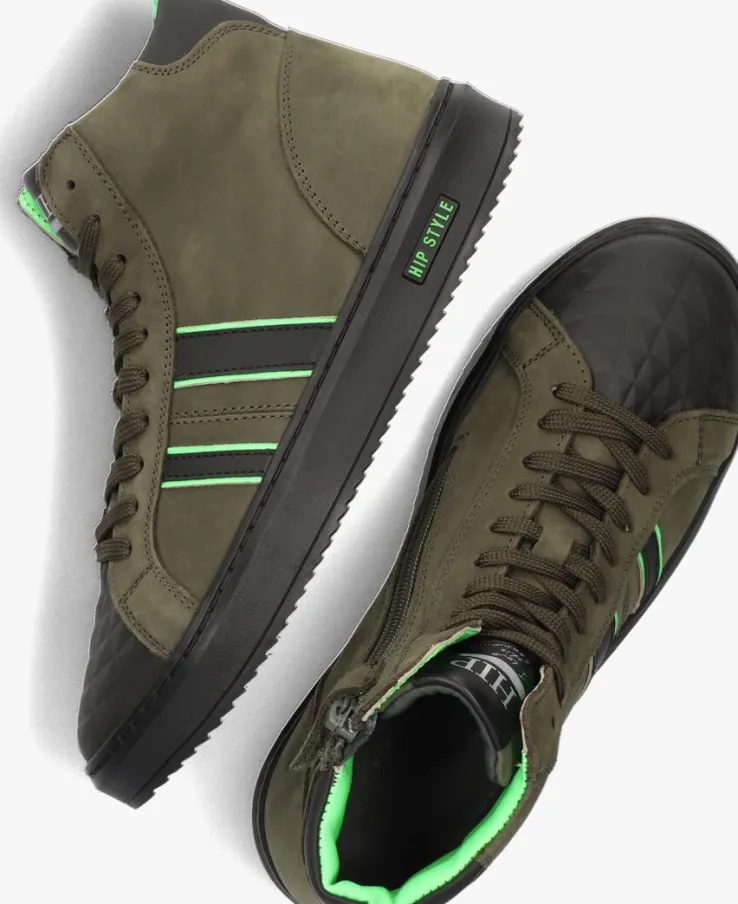 Wil jij hip voor de dag komen? Ga dan voor deze mooie hoge sneaker in een stoere groene kleur. Dit model  H1943 is van het merk Hip en is aan de buitenkant gemaakt van nubuck. Opvallend zijn de neongroen en zwarte details en het leren hielstuk. De binnenkant is gevoerd met leer en heeft een uitneembaar voetbed. De neus heeft een speels 3D reliëf van zwart rubber. De veters hoef je maar één keer te strikken want je trekt ze gemakkelijk aan dankzij de ritssluiting. De rubberen zool heeft een gripvaste profiel en zorgt voor een goede grip en stabiliteit.