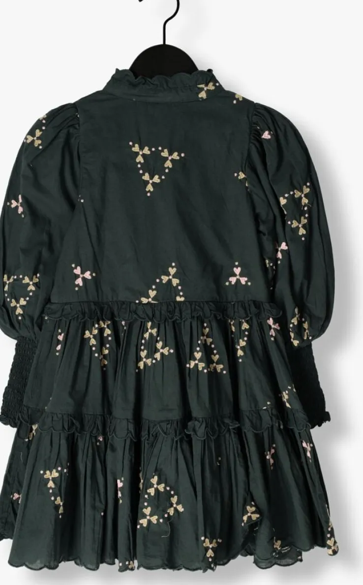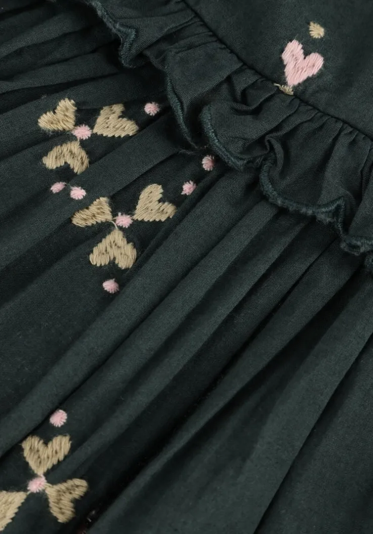 Ontdek de DELA mini jurk van MARMAR COPENHAGEN, speciaal ontworpen voor meisjes die houden van een vleugje groen in hun garderobe. Extra tof zijn de geborduurde hartjes en stippeltjes in de stof. Deze trendy jurk is perfect voor elke gelegenheid.