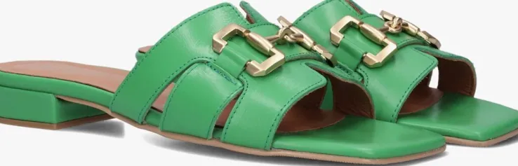 De Italiaanse ontwerpen van het merk NOTRE-V zijn er voor de moderne vrouw die graag gekleed gaat volgens de laatste trends. De producten zijn gemaakt van kwalitatieve materialen met subtiele accenten en een mooie afwerking. Deze zomerse, groene slipper van gladleer heeft een brede cut out-band over de wreef met een goudkleurige horsebit. Het binnenwerk is gemaakt van soepel, zacht leer en heeft een dempend voetbed voor extra comfort. De rubberen loopzool heeft een laag beklede hakje van 2,5 centimeter en een fijn profiel voor voldoende stabiliteit. Combineer deze slipper onder jouw favoriete zomerjurk of draag ze onder een toffe short!